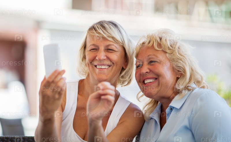 Счастливые пожилые подруги делают селфи на телефоне или смотрят на сделанные снимки и улыбаются