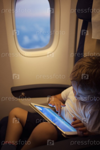 Мальчик проводит время с планшетом во время полета