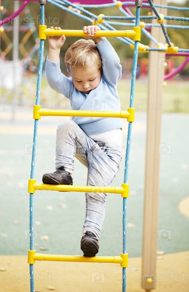 Милый маленький мальчик лазает по тренажерному залу в джунглях