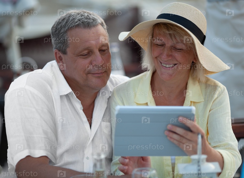 Веселая зрелая пара с сенсорной панелью на открытом воздухе