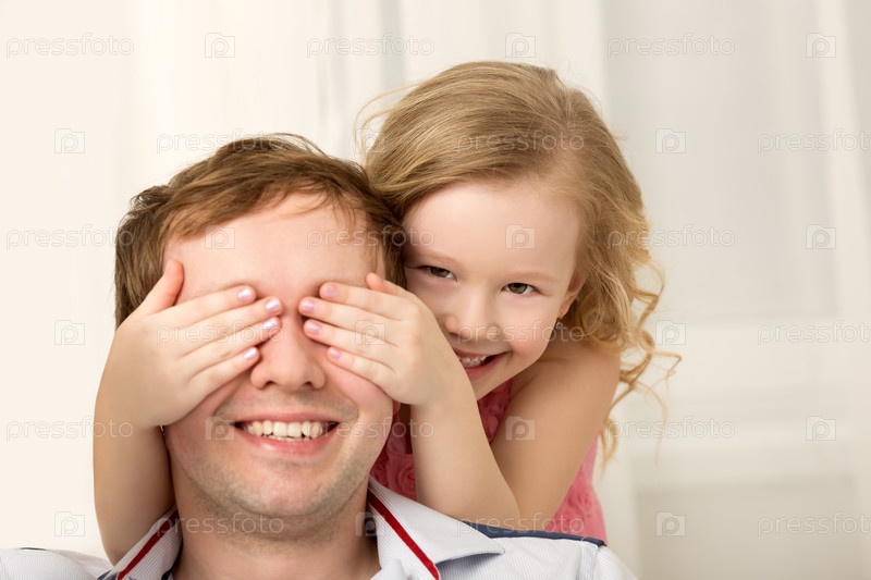 Дочь играет с отцом, закрыв глаза
