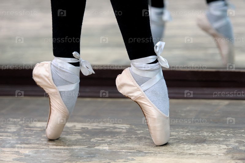 Крупным планом вид на ноги балерин в пуантах на деревянном полу