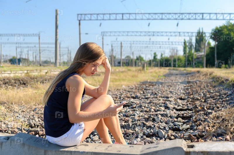Девушка-подросток в топе и шортах пользуется мобильным телефоном, сидя на бетоне недостроенной железной дороги в сельской местности