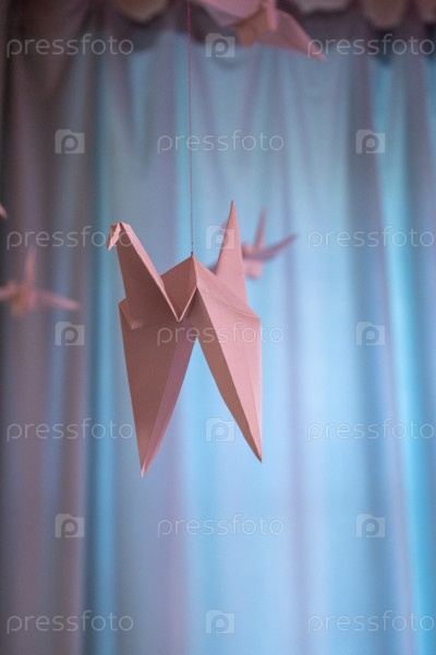 Пастельно-розовые бумажные журавлики, подвешенные на веревках или веревках крупным планом на размытом фоне синих штор. Оригами и ручной работы. Декоративные предметы интерьера