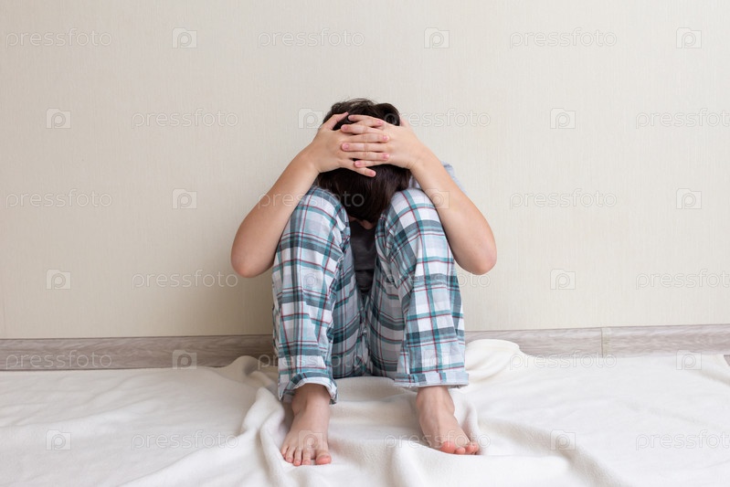 Мальчик-подросток в пижаме сидит на полу у стены