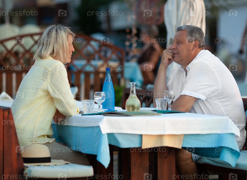 Влюбленная зрелая пара ужинает в уличном кафе