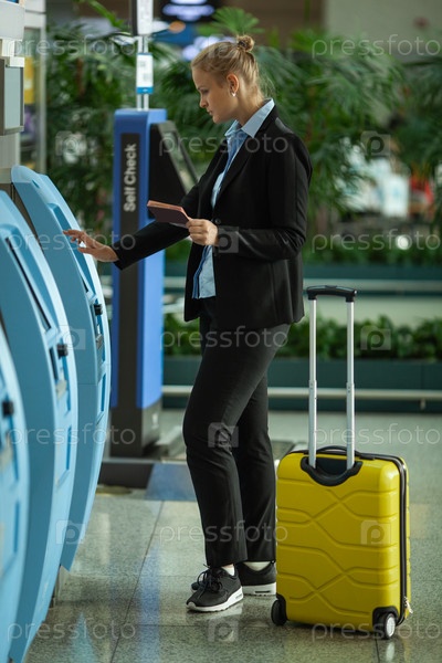 Молодая светловолосая женщина в аэропорту возле терминала самопроверки