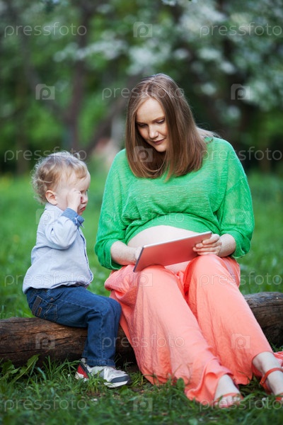 Беременная мать с маленьким сыном с помощью сенсорной панели в парке