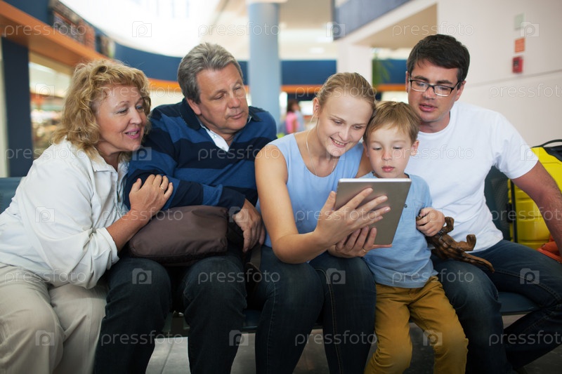 Большая семья развлекается с сенсорной панелью в аэропорту