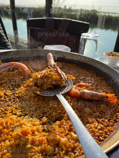 Вкусная традиционная паэлья подается в Эль-Пальмар, Испания
