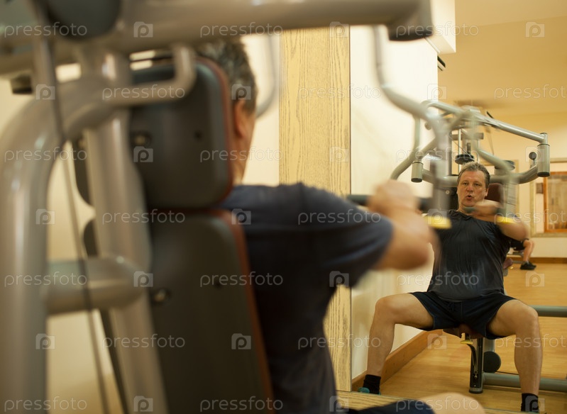 Зрелый мужчина тренируется на тренажере для жима от плеч