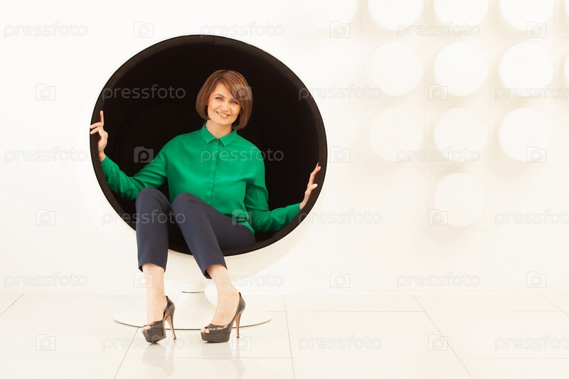 Элегантная женщина, сидящая на сферическом стуле