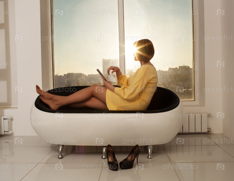 Вид сбоку деловой женщины, сидящей на диване без высоких каблуков