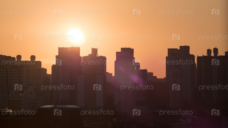 Городские здания в теплом свете утреннего солнца. Сеул, Южная Корея