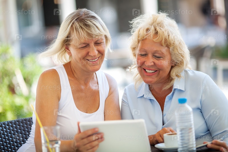 Две подруги используют планшетный ПК в уличном кафе