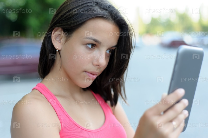 Девушка с помощью планшетного ПК на открытом воздухе