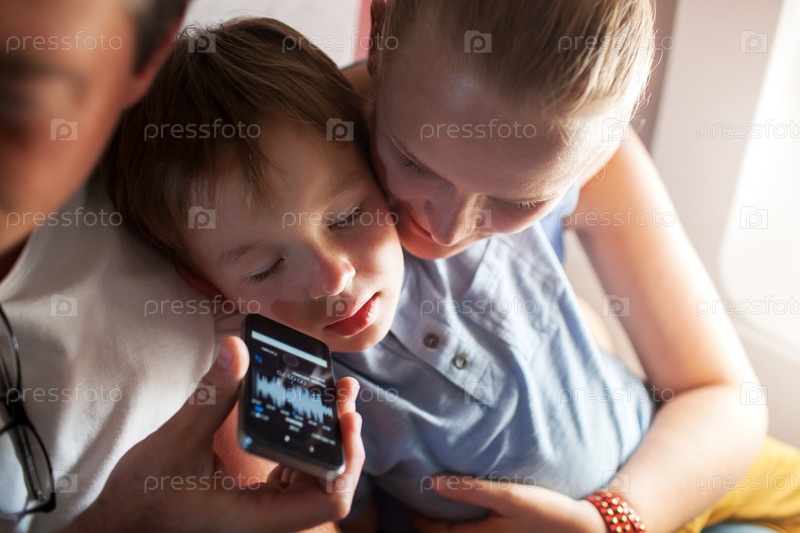 Маленький мальчик спит на руках матери под музыку, играющую на смартфоне в самолете