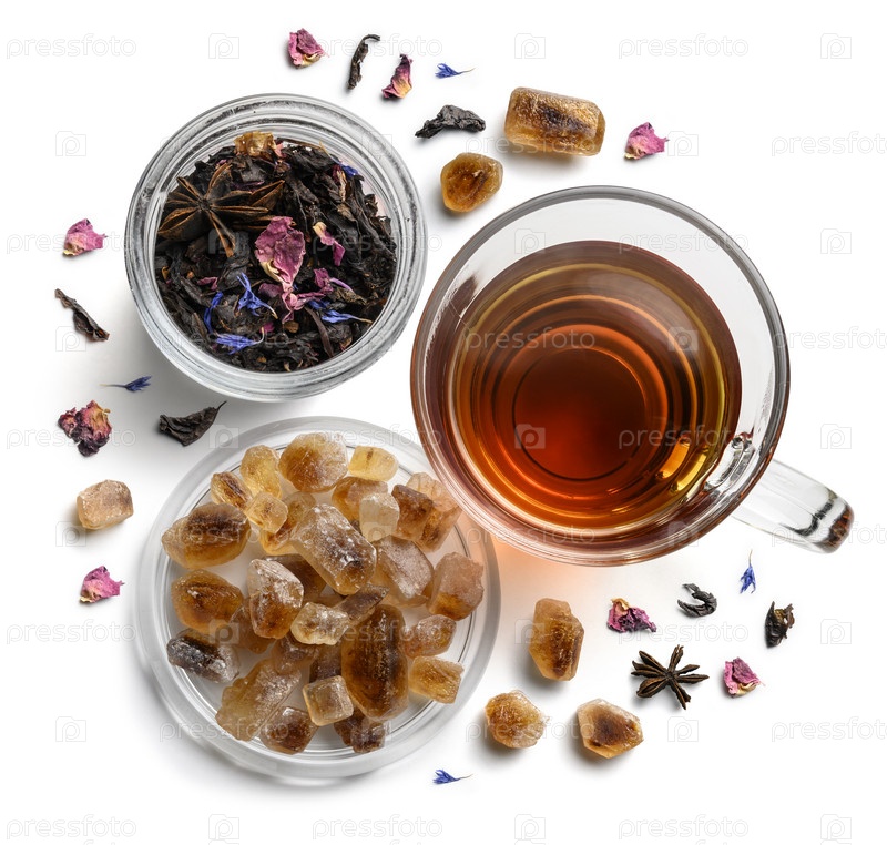 Черный чай с натуральными ароматизаторами и чашкой. Вид сверху на белом фоне