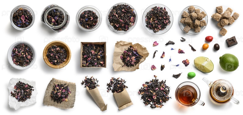 Черный чай и аксессуары вид сверху на белом фоне