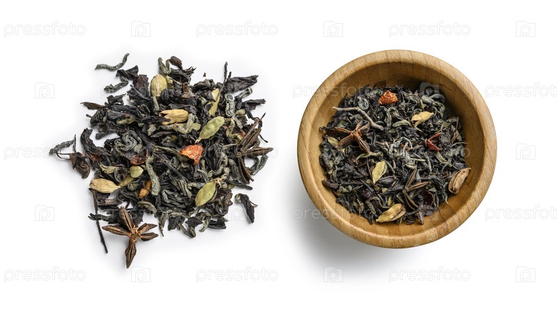 Зеленый чай с ароматическими добавками. Вид сверху на белом фоне