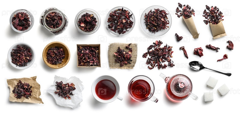 Чай гибискус и аксессуары вид сверху на белом фоне