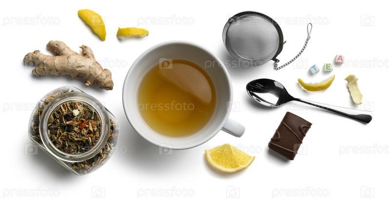 Зеленый чай с натуральными ароматическими добавками и аксессуарами. Вид сверху на белом фоне