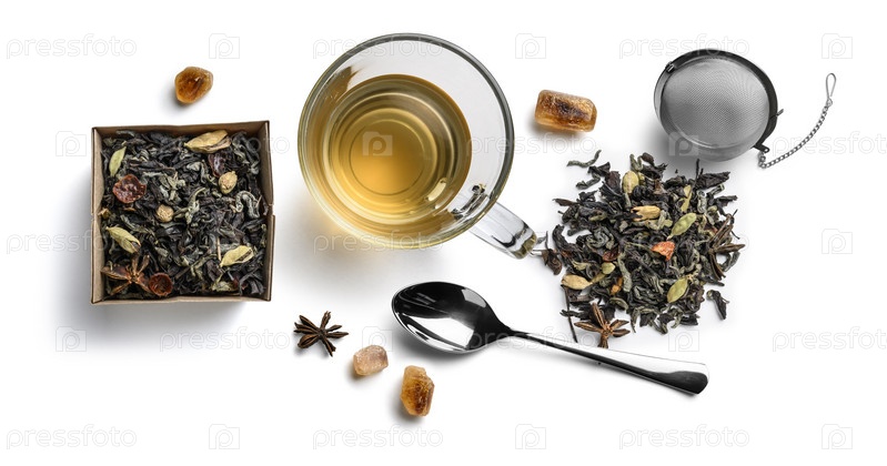 Зеленый чай с натуральными ароматическими добавками и аксессуарами. Вид сверху на белом фоне