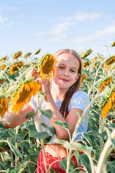 Девушка обнимает подсолнух в поле на солнце. Выращивание и сбор урожая