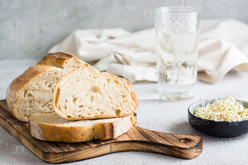 Нарезанный зерновой хлеб с отрубями на разделочной доске, микрозелень и стакан воды на столе. Органическая диета