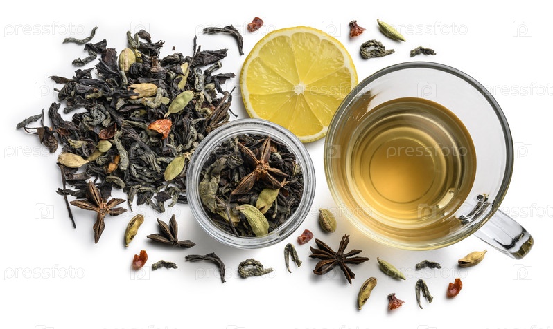 Зеленый чай с натуральными ароматизаторами и чашкой. Вид сверху на белом фоне