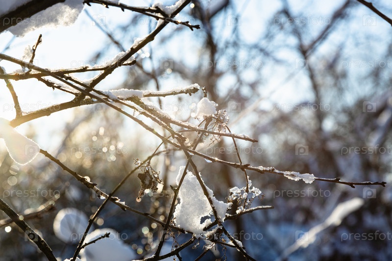 Замороженные ветки дерева крупным планом, освещенные заходящим солнцем