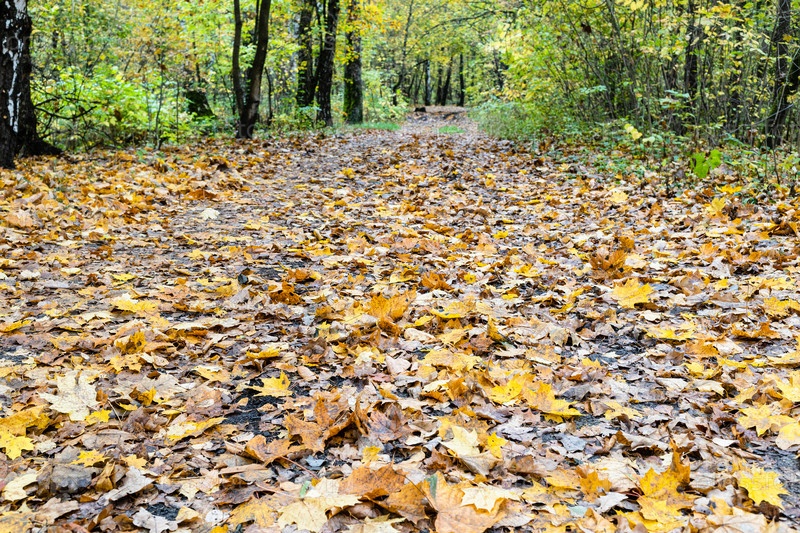 Поверхность пешеходной дорожки, покрытая опавшими листьями