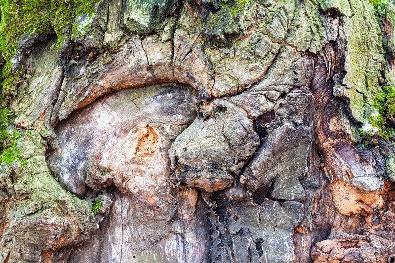 Сучковатая кора на зрелом стволе дуба крупным планом