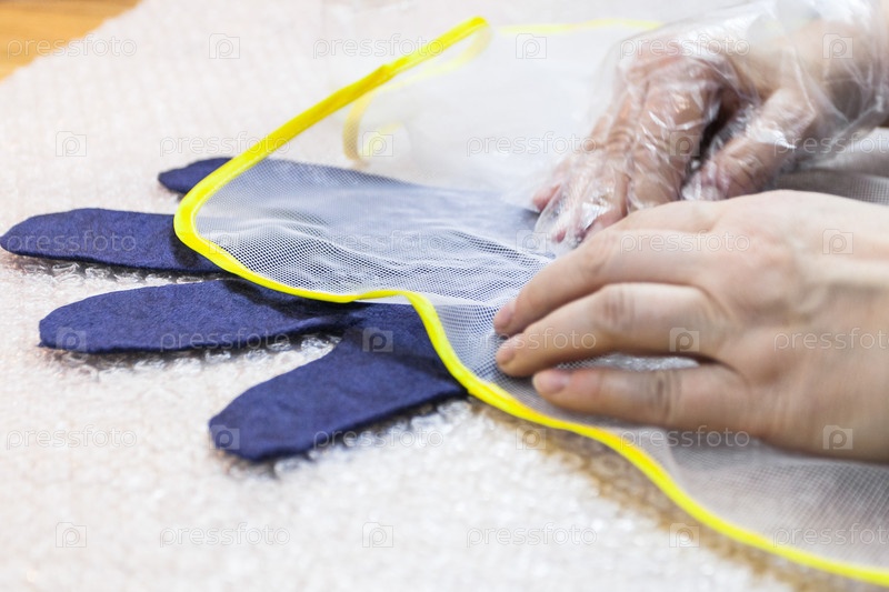 Мастер втирает волокна в перчатку через сетку