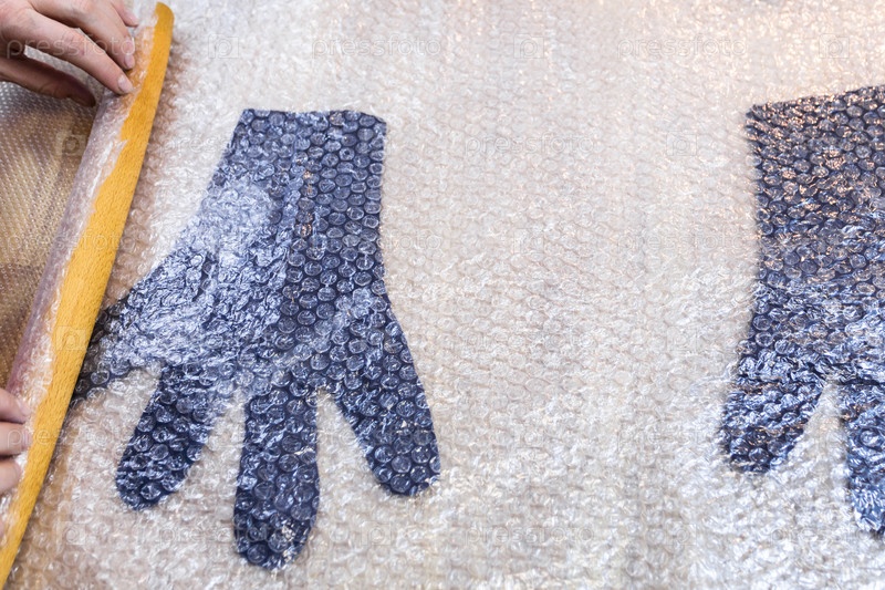 Мастер сворачивает валяные перчатки в коврик с помощью булавки