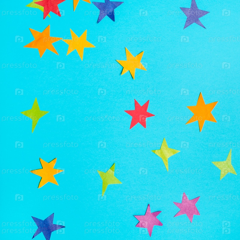 Звезды вырезанные из цветной бумаги на синей бумаге