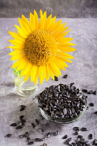 Подсолнух в стакане и семена в миске на сером столе. Натуральное питание и урожай. Вертикальный