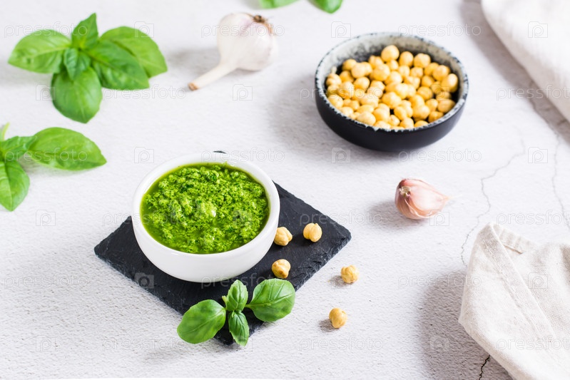 Домашний соус песто в миске и ингредиенты на столе. Здоровая итальянская кухня