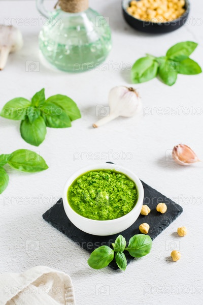 Домашний соус песто в миске и ингредиенты на столе. Здоровая итальянская кухня. Вертикальный вид