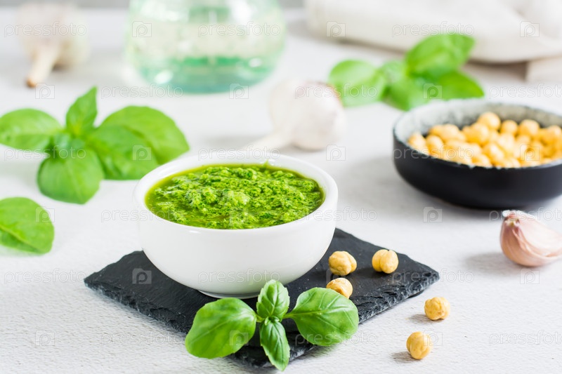 Соус песто из свежего базилика в миске на столе. Домашние пикантные закуски