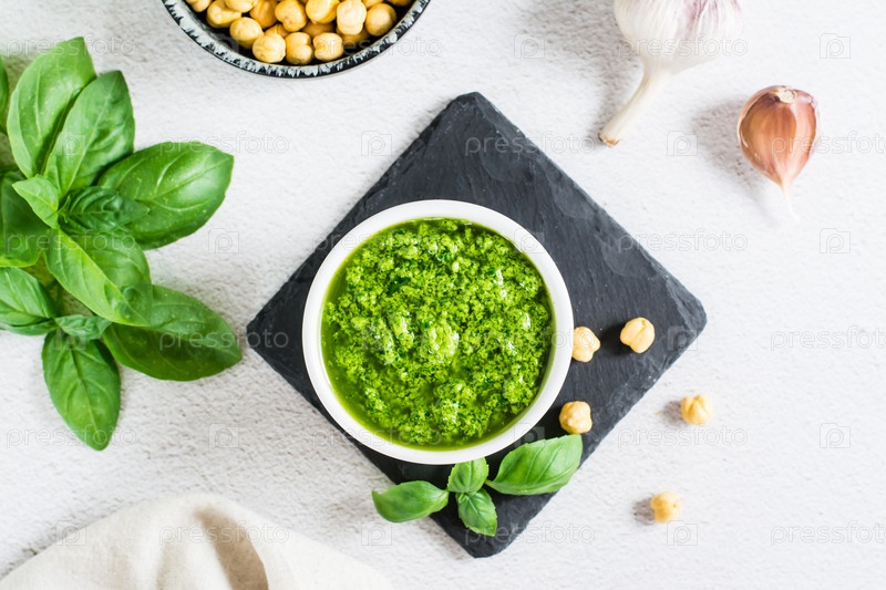 Домашний соус песто в миске и ингредиенты на столе. Вид сверху. Крупный план
