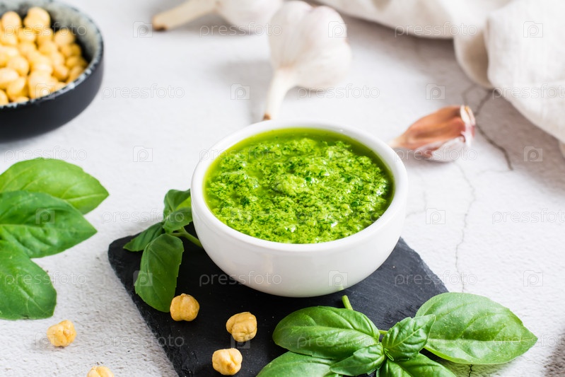 Соус песто из свежего базилика в миске на столе. Домашние сытные закуски. Крупный план
