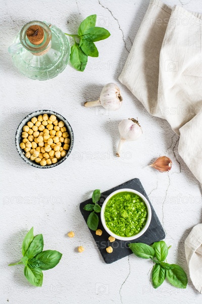 Домашний соус песто в миске и ингредиенты на столе. Верхний и вертикальный вид