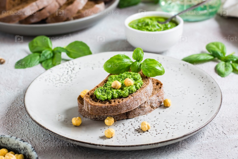 Свежий бутерброд с песто и нутом на ржаном хлебе на тарелке на столе