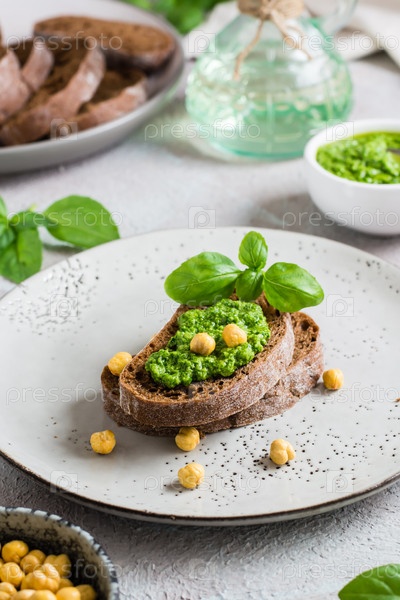 Свежий бутерброд с песто и нутом на ржаном хлебе на тарелке на столе. Вертикальный вид