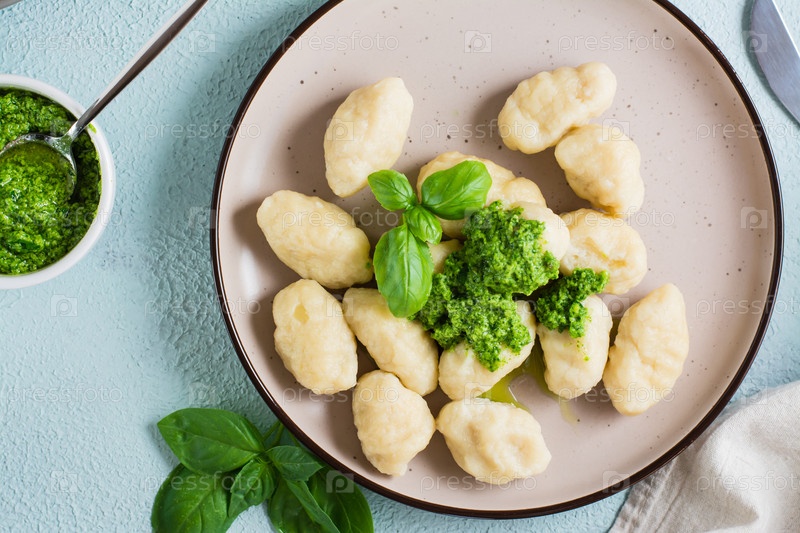 Картофельные клецки с соусом песто на тарелке. Итальянская традиционная кухня. Вид сверху. Крупный план