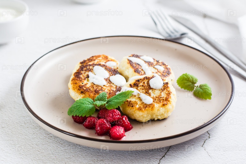 Блинчики с творогом со сметаной, малиной и мятой на тарелке на столе