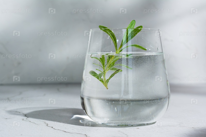Стакан с освежающей водой и розмарином на столе в тени листьев дерева