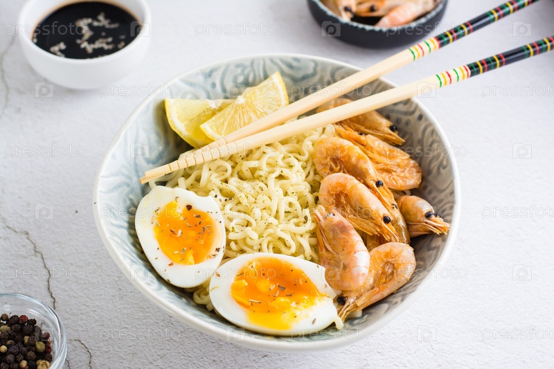 Китайская лапша с жареными креветками, вареным яйцом и лимоном и палочками в миске на столе