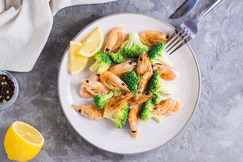 Жареные брокколи и креветки на тарелке на столе. Вид сверху. Крупный план
